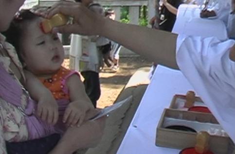6月1日木曜日晴れ栃木県足利市の足利冨士浅間神社『初山ペタンコ祭』に行ってきた。このお祭りは0歳児の赤ちゃんが6月1日に参加するもので、6月26日生まれのリラは3月生まれのハナが行った時よりぜんぜん大きい。なんでも約300年も前から続いているお祭りで足利市重要文化財に指定されている。おもしろいお祭りなので、ニュースでもやっていたから知ってる人もいるだろう。お参りは男山(男浅間)と女山(女浅間)にわかれていて、女山のほうが低い。で、それぞれの山へ登ってお払いをしてもらい、おでこに朱印でペタンとハンコを押してもらう。ハンコも男の子と女の子とではデザインが違う。男の子は桜の花の形で日本男児の強さをイメージ。女の子は四角形で富士山が描かれている。こっちは清らかで健康なイメージ、だそうです。まぁ、でも女の子が男の子のハンコを押してもらってたりその逆だったりと今は自由なようですが。リラは女の子のをおでこに押してもらった。左腕に男の子のハンコも押してもらった。しかし、とにかく暑くて男山のほうは汗だくで登ったよ。ブラウニーもよくがんばった。(一緒に登ったがハンコは押してもらえなかった。)男山の頂上付近でカキ氷を食べた。久しぶりの味だった。一気に完食したよ。スゴイ!そして帰りはひぃおばあちゃんのところに。相変わらず元気なひぃばあちゃん。先日2階の窓から伸びた木の枝を切って、胸筋が筋肉痛になった92歳である。