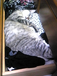 早いもので8月ももう終りますね~うちのおネコ様達はまだ暑そうですwそして最近のマイブームみたくたんすの中で「おねんね」閉めて出かけても器用にたんすにぶらさがり自分の体重を利用してあけてます(;´▽`A``まぁ・・・いつも洋服はコロコロしてるんだが><気持ちよさそうだし(-ω-)こまったなぁ・・・・・キレイにハマってますw ちびチャンは紙袋で遊んでます!ついついあると入りたくなるんだよね!