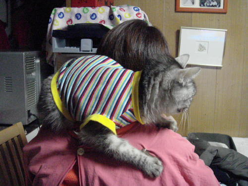 昨日は皆さんσ(⌒▽⌒;) ボクのクイズにお答え頂いて~(=^‥^)/。・:*:・゜★,。・:*:・゜☆ ありがとニャ!僕はね毎日ココに居るんだよココに居ると凄く安心してしまうのだよ(*^m^*) ムフッでも。。。。。。。。。┗(-_-;)┛オ・・オモイ… からどいて!!てと言われるんだ。。。ρ(▼、▼*)チェッでも直ぐにまた乗って安心して過ごしてるのだよで!そのσ(⌒▽⌒;) ボクの凄く好きな安心できる場所はρ( ̄∇ ̄o) コレ母の肩の上で過ごすのて最高だよ~正解した方オメデトーσ(⌒▽⌒)丿今日は良い事あるよキットうふ♪(* ̄ー ̄)v