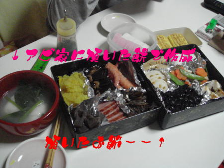 年末の私は何だか忙しかった。。。。。と、言っても嬉しい事ばかりだったのだが(*^m^*) ムフッまずは仕事納めの28日夜のシナモンが初の一人トリミングに行ったもうマジ心配だったウ・・ ウン(・_・;)何時もバジル命の彼はバジルと行ってもバジルが少しでも見えないとヒーンヒーン泣き叫ぶて聞いていたし(・"・;) ウッ大丈夫かと…o(;-_-;)oドキドキ♪で帰ってくるまで何も手に付かない程だった(大袈裟な事)しかし!!シナモンを送ってくれたトリマーさんから言われた言葉は「シナちゃん凄く良い子でしたよ!」と(ノ´▽`)ノオオオオッ♪シナちゃん偉かったね~~(○'ω'○)ん?て事はこの先トリミングに出すときはシナモンだけが良いのかも?なんて事思ったりしてε=Σ( ̄ )ホッだった翌日お休み初日の日携帯からウニの動画日記上げたら直ぐに1本のメールが届いた孫様連れて今から遊びに行ってもいいですかぁ~~~て何でも息子が急に仕事になったとか(・0・。) ほほーっ最近ギックリ腰したばかりなので3人見るのは辛いのでと嫁様からのメールだったOKとメールしたらお昼前に嵐はやってきた(爆)お昼から夜夕飯食べて帰るまで時間上の2人と遊んで暮らした初めてユイさん(5歳)ハル君(2歳)を連れて近所のイオンにお買い物テクテク・・・o(゜ー゜o)。。。。3歩いて行ってきた出かける前に嫁様から「ハル直ぐに何処かに行ってしまうので宜しく」と言われて思った「やはり親子の子だわね坊主もそうだった(* ̄m ̄)プッ」なんて事思いながら3人で初お買い物に行ったのだがハル君この婆は当てにならないと思ったのか(核爆)確り手繋いで離さないブワッハハ!(▼▽▼)人(▼▽▼)ブワッハハ!!迷子どころか非常にお利巧さんだった(* ̄m ̄)プッお正月も直ぐそこなのでお年玉代わりにダウンジャケットをプレゼントしてあげましたです~しかし彼らが帰った後ソファーの下のはお菓子の屑やらピザの屑やらチョコレートの屑で一杯物君大掃除してたですプププッ(* ̄m ̄)ノ彡☆ばんばん!!嵐がさった後だしたぁあああ!翌日はワンは全てトリミングに行ったので今度は私達の番だとて事でトリミングに~~びゃははは (≧ω≦)b正月も近いので思いっきりキンキンにメッシュ入れて頂きましたです(* ̄m ̄)プッても1本ですがね( ´艸`)ムププ今年は更に派手に飛躍してしまうだ(`ー´) クククッそしてその晩犬のツボさん御一家が来て下さって楽しく過して翌日の昨日はお昼間にアビパパアビママがなーーとお餅差し入れして下さり夜には友達がお母さんが作った黒豆とたつくり要る??て電話して来てくれたので即座に(≧∇≦)ノ ハーイ♪と答えたらこんなのがきたですρ(・д・*)コレ 黒豆とたつくりだけだったのだが立派なお節になってきた(*≧m≦*)ププッそんなバタバタ嬉しく楽しい年末を過してて新年のカード作りがしてなかったので慌てて急遽シナちゃんだけのカード作成したのですが本当はねミンバジもイノシシバージョン協力してくれてたので(ミント頭でかくて被れなかったのだが。。。。。。。)(o・。・o)あっ!そうそう~ちなみにこのイノシシ被り物は会社の会長殿が提供してくださましたですプププッ(* ̄m ̄)ノ彡☆ばんばん!!あの方これ被って年賀状に写真入れたのびゃははは (≧ω≦)bお揃いなり~~~~~~と言ってあげようこれ見せて(*≧m≦*)ププッてーーー!事で改めて今年も宜しくなのです(@⌒ο⌒@)b ウフッ