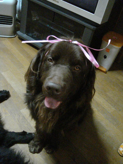 昨日頂いたケーキにピンクのリボンが付いてたの片付けようとしていたらそこへシナモンがやってきておかぁ~~~ん何それ??エー?(ё_ё) (ё。ё)ナニー?と興味しんしん(*≧m≦*)ププッなので可愛いシナちゃんに変身させてあげました(≧∇≦)ブハハハ!ρ(・・。) コレシナ君大変お気に召したご様子で(⌒~⌒)ニンマリしてるわぁ~シナモンて本当被り物とか好きなんだよね(。・m・)クスクス横に居たバジルにもオリボン付けてあげたらバジル君どうもご機嫌斜めなご様子(・"・;) ウッカメラ向けたらo( ̄ ^  ̄ o) プィッ!て横向かれてしまいましたとさぁ~(T▽T)アハハ!