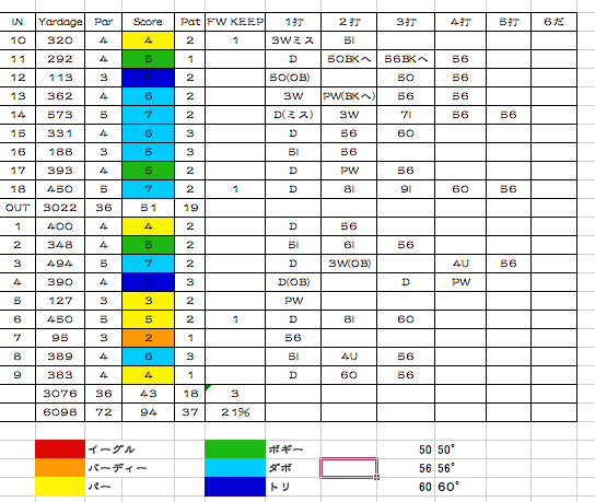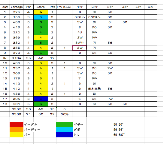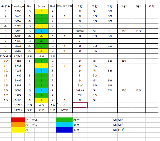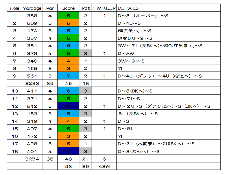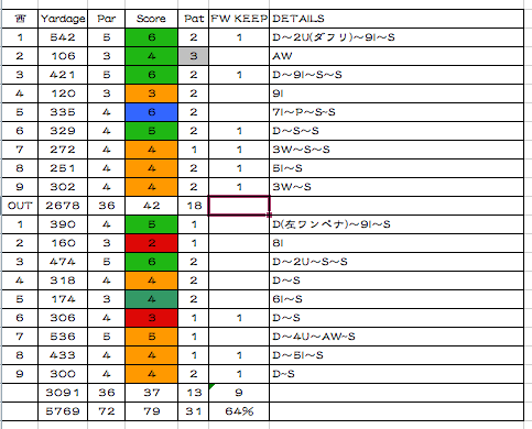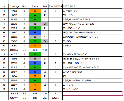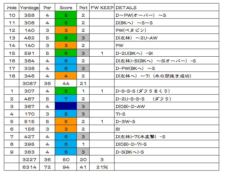 10時IN スタート。山の上のコースですが、コース自体結構フラットで、ところどころ、いい景色に出会えます。お昼ご飯は、ご飯おかわり自由で、たくさん食べてしまいました。簡単に気がついたコースの特徴。4番 PAR 5 ティーショットは、打ち降ろしで、250ヤード先にクリーク。 クリーク超えを狙って力んで、右の崖に。。。打ち降ろしは、気持ちがいいです。5番 PAR3 崖越え。6番 PAR4 右ドッグレッグで、フェイド系のボールで攻めると、グリーン手前まで、いけますが、 グリーン手前のバンカーはかなり難しい!9番 PAR5 教会の階段 と呼ばれる、バンカー群。これにいれると、出すだけになりそう。。 ティーショットで、250以上飛ぶ方は、左の林の一番右の大きな木超えが可能!今日のプレイ。前半3HOLE 続けて、1メーター弱のパットを外し、3パット。これが痛かった!OB2発。フェアーウェーキーぷ 21%パーオン 33%ボギーオン 44%精神的なもろさが、もろに出ました。出だしの3連続3ぱっとを、最後迄、引きずる結果に。<IN>HOLE101112131415161718TOTALYARD4873954073751493893631504863201PER54443443536SCORE66653573647Pat33322212220<OUT>HOLE123456789TOTALYARD3461733725031433263943414763074PER43453444536SCORE53574456544Pat22311221115