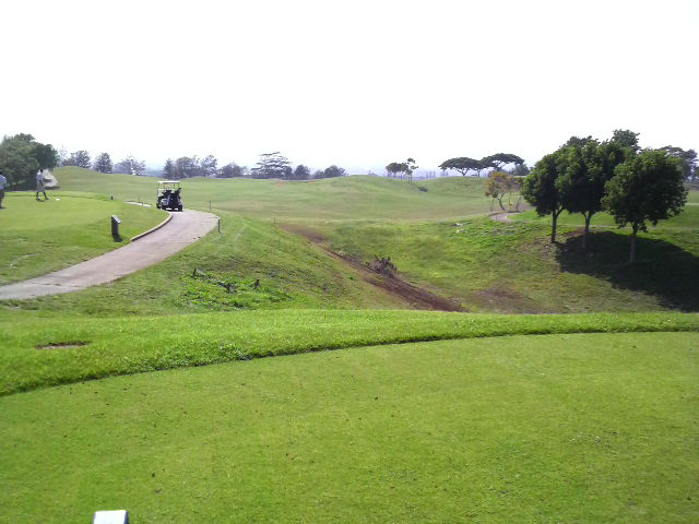 パールカントリー終了が、10:40だったので、今回のレンタカーも今日までだったこともあり、思い切って、こちらewa beachに電話。http://www.ewabeachgc.com/enter.htmlそしたら、現在、芝の張り替え作業が、先週から始まっていて、それでもいい方に関しては、先週から明日まで$30でPLAYさせているようで、この金額にそそられて、そのまま、EWA BEACH へ。。。今回は、SINGLE PLAYなので、現地のおばさんと一緒になるはずが、途中渋滞に巻き込まれ到着が遅れ、ご一緒できず、しかも、な、なんと、現地で定年退職されたおじいさん達20名くらいの団体の後ろになってしまい、SHOCK....長い待機になるなと思い、スターターのおっさんとずっと、おしゃべり。。。スターターの人って、いい人多いですよね。。。。そしたら、かなりLUCKYな事が起る!!!!!まず、スターターのおやじ曰く、張り替え作業が、ほぼ終了していて、コースは、本当に最高の状態だよって。。。まじ~~~、張り替えのおかげで通常カマアイナ料金$51が、$30で出来て、しかも、SINGLE...次に、この時間に突然の大雨。。。。。一旦、どこでも、PLAYが中断しているみたいで、スターターの所に何組かは、引き上げてきているし。。。更に、前の定年退職軍団も、”今日はやめて明日にしよう”って。。。つまり、雨があがれば、前はがら空き。。。案の定、15分もすれば、雨は一旦あがり、だ~~れも、先に見当たらない状態で、SINGLE PLAY!!!!!スターターのおじさんも、”あんたはLUCKEYだよ””って。だが、世の中、そんなに甘くない。。雨は、降ったり止んだり。。。。でも、雨対策は、万全なので、PLAYに支障もなく、だ~~~れもいないコースで、ゆ~~~くりROUND!!!!コースですが、最高にいい状態でした。もちろん、雨なので、カート乗り入れは出来ませんでしたが、やはり、気持ちがゆっくりしているせいか、DRIVER/3Wが絶好調で、ほとんど、FW近辺だったので、全く苦にならず。。。。コースは、フラットで海は、まったく見えません。(名前はEWA BEACHですが))FWも広く、池が程よく配置され、しっかり距離もあり、充分楽しめました。平坦なのが、やはり、一番楽だし、SHOTもしやすいし。。(アマチュアですから)今回がおそらく、今までで、一番お得だったかも、しれません。GREENも全HOLE上がったあと、練習して、芝目を理解するようにまわり、アプローチなんかも。。。いやいや、本当にいいROUNDでした。。。すごく練習になりました!!!ただ、こっちのカートに雨よけのビニールはなく、クラブ/バッグはびしょぬれになりました。現地の方は、みんな小さなバック用の傘をゴルフバックの上にさしてました。あれ欲しいと思いましたが、日本では、いりませんね。。BAG TAGは、CHECK IN のさい、くれっていればくれました。。。まずは、門ここが、4番だったかな??11番13番池超えPAR314番 一つの大きな池を10/13/14番で囲んでます。こっちの人って、スコールが来ると、帰ってしますんですね。。それとも、雨はやまないと判断したのかな。。その場合、返金されないと思うんだけどな~~。ど~なんだろ??今週1週間で、9ROUNDして疲れました。。人生初めてこんなに濃厚にROUNDしたな~~。。。DWD 2008MODEL SO COOL!!!