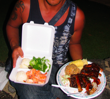 金土日と、GOLFを離れ、一旦SHOPPING&BEACHを楽しみ、だらだらMODEへ。。。この日は、アロハフェスティバル前夜祭。。。19:00頃から、カラカウア通りに一面屋台が並びました。。。夕飯は屋台を食べ尽くそうと思いましたが、いかんせ、こちらの食事の量ときたら、、、とにかく多い!!!!と言うことで、ゆでトウモロコシと、こちらのリブとエビの炒めものを食すことにいたしましたが、やはり、多い!!!!こちらが、前夜祭の風景。そのまま、翌日朝10:00過ぎ頃から、パレードがスタート。。(予定では、9:00となっていたので、待ってたんですが、さすがHAWAII,,,時間通りなんて、ありえません)結局、2時間ちょっとくらいの行進が、カラカウア通りで行われました。今年のテーマは、フラだったそうです!ま~~、だらだらだらだら続くので、のんびりBEACHからまったり見てればよいかと。。って感じでした。島別対抗戦??なのか、各島の方々が旗を持って行進してましたが、でも、のんびりいい休日でした!こんなにBEACHにいたら、こんなに真っ黒に。。。