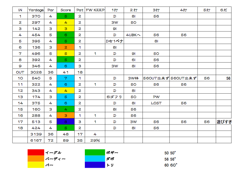 ひどいGOLFでした。。。。雨の中でのPLAYですが、今日は、ぼろぼろすぎてさて、コースですが、完全に初心者向けの簡単なコース?ってイメージだったんですが、いざあがってみるとひどいひどい。。特に特徴のあるHOLEはなく、まっすぐでハザードも少なめ、距離も短めといった、スコア狙いにもってこいなコース。3パット 7回でも、もっとひどかったのが、58°SWのみが、ダフりまくりで、我を見失ってしまいました。こういう経験ってないですか?DRIVERも、普段ドローのボールなのに、この日は、ひたすらまっすぐ飛び、FWキープできず。。。完全に、出直しです!!!