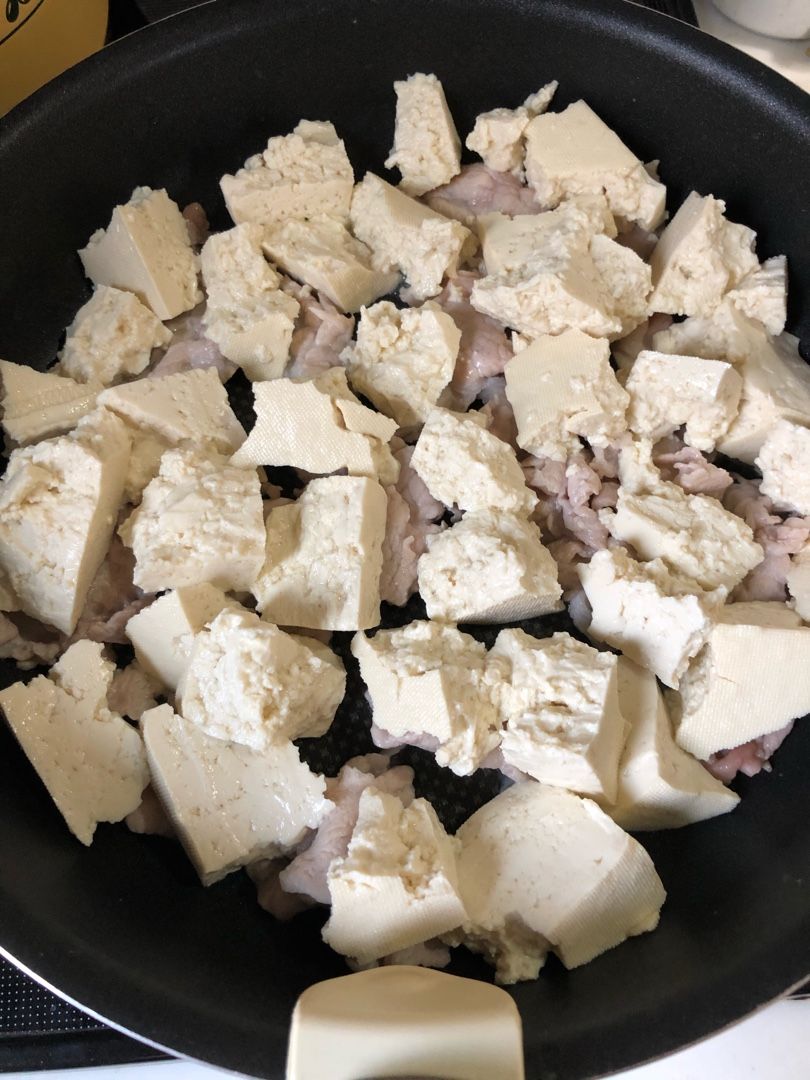 2.豆腐を一口大に手でちぎりフライパンに入れる