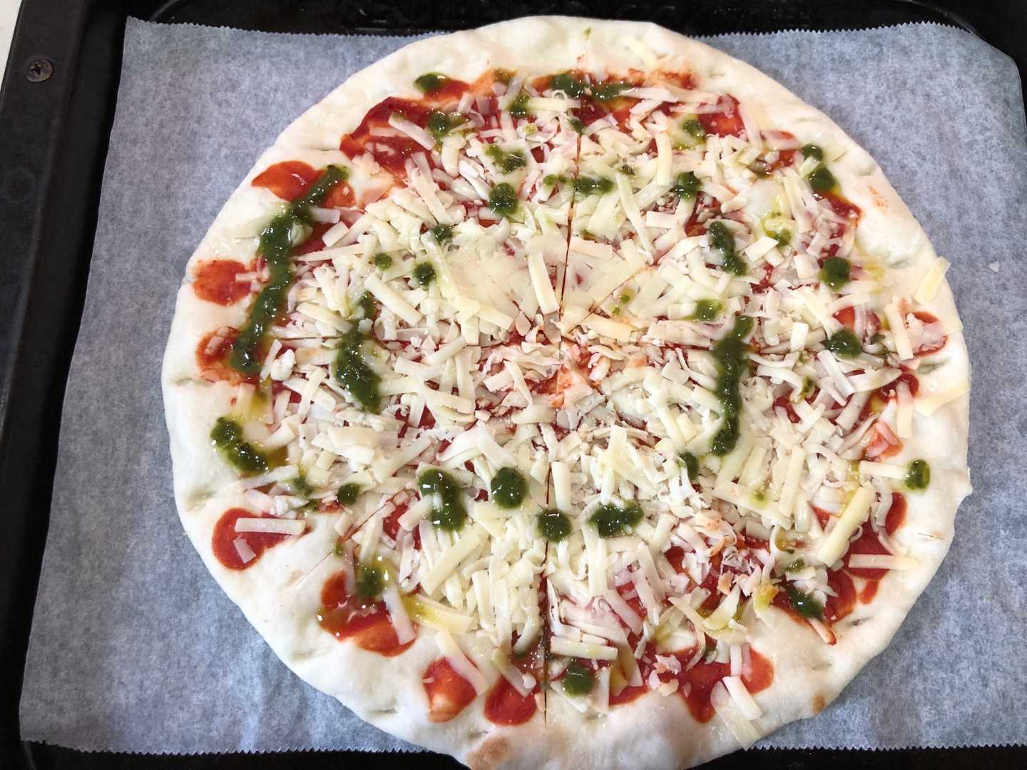 付属のバジルソースをかけて焼きます