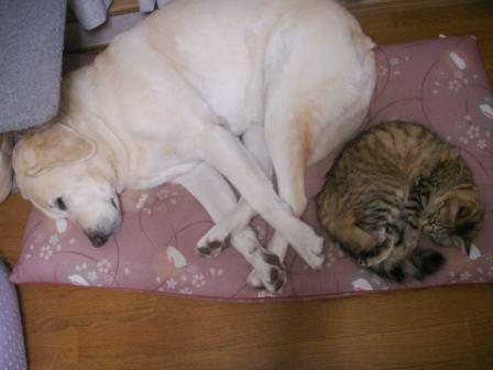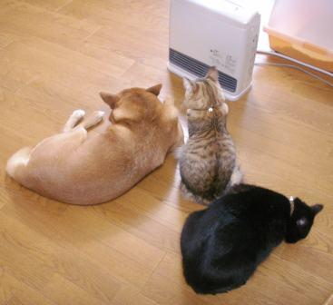 今日は風が冷たくて、チラチラと雪が舞う時間帯もありました。雪、というほど密に降っておらず、これが「風花」かなぁと思って見ておりました。帰宅すると、庭に出していたわんこ2匹は狂喜乱舞。寒かったのでしょうね。家に入れてやり、暖房をつけたところ、こんな状態に。ちょっとちょっとポン(犬)よ、いくらなんでも近すぎないかい?顔焼けるよ。(^^;)体がぬくもったところで、今度はこんな状態に。モンプチは犬用のベッドが大好きなようで、1月8日にもわんこと一緒に寝ていました。しかも、わんことにゃんこ相似形で。親ばかだけど、うちの わんにゃんは本当に可愛い!今日の日記を気に入ってくださったら↓ポチっとクリックお願いします。