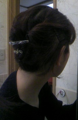 ひょんなことから髪の毛を伸ばし始めた私。もともとくせ毛なので、伸びてくると毛先があっちこっちと、好き勝手な方向へはねまわります。私がこどものころは、毛先がバラバラしているのは「だらしがない」という見方をされていましたが、最近はそれもおしゃれ…とはいうものの、私の髪の毛のくせは決しておしゃれな はね方をしてくれないんです。20年以上ショートカットで気楽に過ごしてきた私にとっては毎朝自分の好きほうだいな髪の毛を見るのが苦痛でたまりません。いっそ切ってしまおうかと思わないでもないけれど、いやいや、一度は夜会巻きをしてから切らなくては!ということで、今日は大雑把にまとめ髪をしてみました。自己流なんですが…まず髪の毛を上半分と下半分にわけ、下半分をゴムでしばります。まだ後ろの髪の毛が伸びきっていないので、くくった先は3センチくらい。それをねじり上げてピンで留めておきます。上半分の髪の毛を左と右でそれぞれねじり、後ろに留めてある髪の毛の束に添うようにピンで留めます。この時点で毛先が3束出来ていることになります。そこを口ばしピン大・小二つを飾りを兼ねて留めたら出来上がり。鏡に映して撮った写真なのでよくわからないかしらん?意外と簡単にできるので、しばらくはこれでいきます。今日の日記を気に入ってくださったら↓ポチっとクリックお願いします。