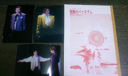 あれからもう1ヶ月もたつんだなぁ…。宝塚歌劇団OGのゆうかちゃんこと椿火呂花さん主演のミュージカル「情熱のパソドブレ」観劇から1ヶ月です。応援していたゆうかちゃんが退団してしまって5年。もう絶対に男役・椿火呂花を見ることはできないのだと諦めていたのに、見事に復活。現役時代と変わらない姿…いえいえ、退団して5年の間のさまざまな経験がいろんな面でプラスに作用して現役時代以上の舞台を見せてくれました。今思い出してもブルッと震えがくるようなそんな舞台…と、物思いにふけっていたら、届きましたよ。申し込んでいた「情熱のパソドブレ」グッズが!待ってましたよーん。グッズは、パンフレット、脚本、メイキングDVD、舞台写真キャビネ版、舞台写真葉書サイズで、そのうちパンフレットは観劇日に買っていたので私が申し込んだのは脚本と舞台写真葉書サイズ。脚本は限定50部で、お稽古場のスナップ写真が掲載されているんです。そして写真は、5枚。この写真には入れていませんが、寿依千さんとチャーリーニーシオさんの写真もあります。他の出演者さまには大変失礼ながら、本当はゆうかちゃん(椿火呂花)の写真をもっとたくさん撮影していただいて販売してもらえると嬉しかったけれど…。で、同封されていた「お礼とお知らせ」にこう書いてあるじゃないですか!「情熱のパソドブレは、応援してくださる皆様の熱い思いを受け止めて、11月東京公演に向けて準備を進めております。」うぉーーー!シルベスタ・スタローンのように両腕を天に突き上げて吠えてしまいましたよ。これは行かねば。早めに判って良かった~。無駄遣いしないで頑張ろうっと。11月だったら着物着て行ってもしんどくなさそうだし。わくわく。今日の日記を気に入ってくださったら↓ポチっとクリックお願いします。