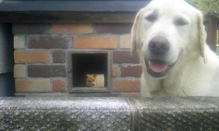 私が出かけるとき、ディディエ(ラブラドール)は いつも一番玄関に近いところまでやってきて見送ってくれます。一方MIX犬のポンは、クールなものです。ほら、よく見てください、犬小屋の向こう側で座ったまま、目線だけこちらに送っています。なんだか面白い構図だぞ、すかさずパシャ!その前に一枚撮った分は、ディディエは鼻しか写っていません。仕事仲間はこの写真を見て「お前を食ってやる!」って写真だね、と。ふーむ。そうとも見える?この構図、もっと画素数の大きいデジタルカメラで撮って次の日めくりに応募してみよう!今日の日記を気に入ってくださったら↓ポチっとクリックお願いします。