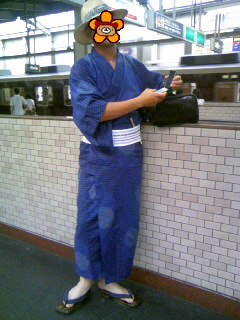 本部前に、浴衣姿で帽子をかぶった男性が。
