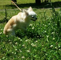 朝から良い天気でお散歩日和。午前中に自分の病院もあるけど勿体ないよね。と急いで翔ちゃんの好きな公園へカートで連れて行きました。途中は降ろしても歩かず帰りたがったのに公園の芝生を見たら一目散に走ってチーしてからの大はしゃぎ。(*≧m≦*)草が延び放題で楽しそうね♪シロツメクサを摘んでワンちゃんこれ食べる?(う~ん食べないと思うケドネ^^)それでも あげるねと私に持って来てくれた4歳の女の子。まだ2才なの?可愛いねって言ってくれたあなたも可愛くて優しいお姉ちゃんでしたョ。嬉しいな♪アリガトネ。(*^_^*)そんな間も伸縮リードで吹っ飛び歩いてた翔でした。ボク2歳だからね…(=゜ω゜)ノ