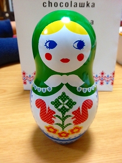 毎日、寒い日が続いていますね。ご無沙汰しておりましたが私や家族はとても元気に日々、過ごしております。ただ、周りの環境にいろいろと変化があり、いろんなことを考えさせられる毎日だったりします。健康であることのありがたさ、家族が一緒に暮らせることのありがたさ基本的なことを再確認させられる時期です。2月=一番寒い時期!と言うイメージで本当にこの時期は苦手です。早くぽかぽか陽気の春になって欲しいなー。さて、2月と言えば、先日バレンタインデーでしたね。いつも結構吟味して買うタイプなんですが今年は、決めるのが早かったです。一目ぼれの即買いです。完全にこのマトちゃんに惚れました。大・中・小と3サイズありましたが予算の都合で真ん中サイズの中をお持ち帰りしました。メリーのチョコなのでお味も安心です。半分にぱかっと開く様になっており、中身にチョコが入っております。マトリョーシカ好きにはたまらないアイテムです。
