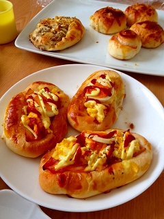 あらーもう6月なんて・・・。今年も月日が早いこと。もう折り返し地点ですね。ココ最近、元気にやっていますがブログに書き留めるほどの大きな出来事もなく、スマホに変えてますますパソコンに向かう時間も減りほとんどスマホで用事を済ませています。放置し続けていたmixiもひょんな出会いから本格的に再スタートし、つぶやきもちょこちょこと。なので何を書こうかなーとネタを物色していたら、ちょっと前にパン作りをした画像を発見。このパン生地、クックパットからレシピを頂いたのですがとっても美味しい生地でした。我が家は、一応ホームベーカリーがあるんですが食パンは、みなあまりお好きではなく、菓子パン派なんで生地作りがメインです。今回は、ツナオニオンパン、ベーコンエッグパン、オレンジパンを作りました。我ながらなかなかの出来栄えです。甘いパン、惣菜パンなんでも合う生地でした。ただ、作るのは楽しいのですが後片付けでどっと疲れました。今度は、クランベリーパンにチャレンジするつもりです。