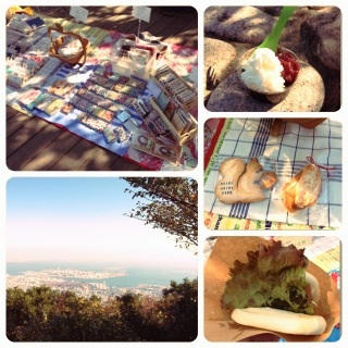 ずーっと雨で行けなかった、今年初のリュックサックマーケット。今日もなんだか怪しい天気予報でしたが朝起きるとすばらしいお天気。朝早くからがんばって参加しました。今回は、いつもの場所とちょっと違う場所をチョイスして!後ろを見ればこんな感じ。とってもキレイな神戸の街が見渡せます。そして、ディスプレイはこんな感じ。いつも、行って適当に並べるのでアバウトですが・・・。たくさんの方とおしゃべりしたり、買って頂いたりと楽しい一日でした。お買い上げ頂いた方々、本当にありがとうございました。どうぞ、たくさん使ってくださいねー。ただ、日差しが強くて思い切り、腕と顔が日焼け状態で辛いです。夫のシーブリーズを借りてクールダウン中。お店番をしているとあまりうろうろは出来ないのですがそれでもちょこちょこと欲しいものがあれば買っちゃう。今回の収穫は、ちっちゃなバックのチョーカーとローズウッドのオイルそして靴下とムーミンクッキー。ムーミンクッキーは、残念ながらパキッと折れてしまいましたがおいしく頂きました。ついついかわいいものを見ると財布のひもが緩んでしまいます。最後に青空カフェさんのコーヒーを頂いてほっと一息。疲れが吹っ飛ぶぐらいの良いコーヒーの香りに癒されました。来月もお天気ならば、ぜひ参加したいと思っています。リクエストもいろいろと頂いたので頑張って作って行きたいと思いまーす。