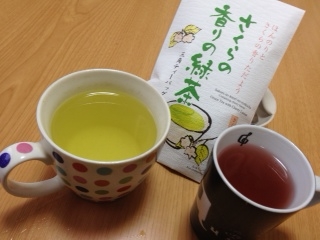 すっかり暖かい気候になりました。ジャケットを着てお買物に出て行くと汗ばむぐらい。先日、義母が京都に遠足に行って来たそうでそのお土産にさくらの緑茶を頂きました。暑いと言ってもまだ、ほっと一息は、温かいお飲み物が落ち着きます。娘は、ほうじ茶が最近のブーム。ほんのりとさくらのお味が漂う緑茶です。春ですね・・・。
