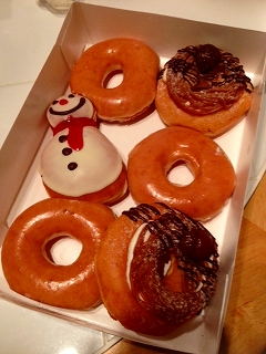 ちょっと前に夫が用事のついでにクリスピークリームドーナツを買って来てくれました。画像のものは、もう販売されていませんが記念に!ゆきだるまちゃんがかわいいです。ここのオリジナル・グレーズドは、もうたまりません。このふわふわ感とこの甘さ(笑)きっとご近所だったらえらいことになっているでしょう。好き過ぎて、iphoneのアプリまで入れてしまいました。今、丸いものをドーナツに加工する写真にはまっています。丸いものを見ると条件反射のように写真を撮りまくっています。