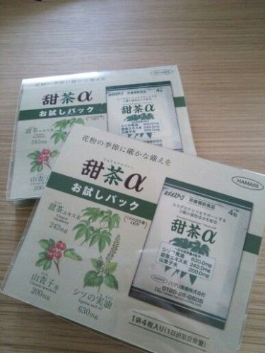 つらいつらい花粉の季節がやってきました。先日こんなサプリメントをいただいたので20日間モニターしてみました。 『甜茶α』「甜茶」 「山査子」「シソの実油」という3つの健康成分入りで花粉の季節もスッキリ過ごせるというもの。 1日4粒。 20日間飲んでみて。ちょっと効いてるかも。さすがに最近はがっつり花粉飛び始めたので薬がないとツラくなってきましたがこれのおかげで症状の出方はゆるやかでした。いつもなら鼻水と目のかゆみは同じように症状が出るのだけど今年は鼻水少な目です。 飲み続けるともっといいのかもしれません。 ハマリの健康食品とスキンケアクリームファンサイト参加中