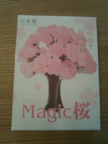 Magic桜なるものをいただきました。 こちら、12時間で桜の花が満開になるというちょっと不思議なアイテム。 中身は透明なトレーと紙製の桜の木と透明な液体。 紙製の木のベースが液体をすって桜の花を咲かせるのだそう。 まずは桜の木の枝を広げます。 ここでしっかり広げるのがきれいに咲かせるポイント! 液体を枝にまんべんなくかかるように注ぎます。 が。 これがめっちゃ難しい。 こぼれるので受け皿の下に受け皿を置くのをおすすめします。 液体をかけると枝がくっついてしまうのでここでもう一度広げます。 そしてあとはただ待つだけ・・・ 2時間後 ちょこっと枝の先にピンクのふわふわとしたものが現れました。 4時間後成長してるっ! 6時間後ほんとに桜の木みたいになってきた。 8時間後ピンクのフワフワしたものがもこもこと成長します。これってそろそろ満開かなぁ?って思ってたのだけど・・・ 翌朝12時間以上たってます。 めっちゃ満開!想像以上の成長っぷりでした。 きれいに咲かせるポイントはふたつ。枝をバランスよくしっかり広げる事。液体(これが花になるので)をこぼさないように注意する事。 透明のトレーはペラペラなので液体が入っている間は動かさない方がいいと思います。満開になれば液体は無くなるので飾る場所を変えるのはそれからですね。 色といいシルエットといい本物の桜みたい30日間くらい楽しめるそうです。 ちょっとずつ花が落ちていくのも桜のようで風情があるね。 これは成長過程も楽しめるしちょっとしたプレゼントなんかにもおすすめです。 【メール便送料無料】自分で咲かせる不思議なマジック桜。桜 ミニ盆栽 プレゼントやお土産にも/...価格:880円(税込、送料込)おとぎの国ファンサイト参加中