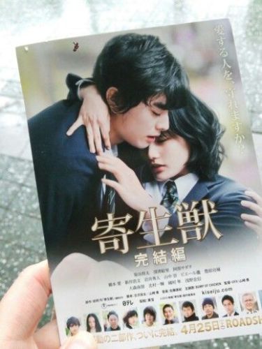 お正月に前編を観ていたのでGWに完結編観に行こうかな、と思っていたらなんと完成披露試写会に当選しました♪ 東京ドームシティホールで監督と出演者の舞台挨拶付き。めっちゃ楽しかった~。 アリーナ客席の中央を舞台に向かってレッドカーペットが敷いてあり監督出演者がそこを歩いて舞台上へ。その途中にミギーの目をデザインしたボールを客席に投げ入れるという演出もあり始めから大盛り上がりでした。早くに座席券の引換えをしていてアリーナ席だったのでめっちゃ近くで見られました。でもボールはキャッチできなかったぁ・・・ 登壇者は山崎監督、染谷将太くん、深っちゃん、阿部サダヲさん、橋本愛ちゃん、新井浩文さん、 ピエール瀧さん。阿部さんは撮影時は染谷くんとしか会っていないのだとか。声と動きだけなので共演者と芝居するってことがなかったのね。前編を映画館で観たそうでエンドロールに自分の名前が出た時後ろから「出てた?」という声が聞こえたそうで今回はしっかり出演アピールをしにきたのだそう。ごめんなさい、実は私も知らなくて「出てた?」と思った一人です(笑) 完結編、 ものすごくよかった!1時間57分の中によくあんなに詰め込めたなぁ、と思いました。前編も観ているというのもあるかもしれないけどものすごく長い物語を見た気がします。前編よりメッセージ性が強いセリフの数々。深っちゃんの演技が好きなので彼女のシーンは泣けました。アクションシーンが多くて話の展開も早いのにしっかりと人間ドラマも描かれていました。 しかし染谷くんはいい役者さんだなぁ。 公式サイトに「おさらいダイジェストPV」というのがあるのでそれを見れば完結編から観ても大丈夫ですよ!
