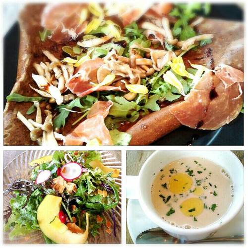 金曜日のランチ。 自由が丘のロンドクレープリーで。 いくつかあるガレットのランチセットの中からサラダとスープorドリンク付きのセット(1100円)を。 おいしそうだったのでスープを選択。 この日はマッシュルームのスープ。 ガレットは3種類から選べました。 選んだのは生ハムとワイルドルッコラと茸のガレット。 菊の花びらものってて秋の雰囲気いっぱい。 ブラックペッパーとバルサミコ酢が効いていてワインが飲みたくなるお味でしたわ。 おいしかった♪ 1人だったのでちゃっちゃと食べて出てきちゃったけどナチュラルな内装が落ち着くので 今度は友達誘ってのんびりしたいな~。