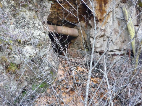 廃地下鉱床が眠る山の斜面。 やはり、ここも冬枯れの季節になると、いろんな物が見えてきます。 画像の壁面もそうなんですけど・・・(汗) 一部の壁面に、赤っぽい「何かが流れ落ちた跡」が残っているんですけど・・・(汗) ちなみに・・・ その一番上の部分を望遠拡大してみると・・・ ぽっかりと廃鉱床の入口が口を開けています!(驚) 入口に渡していて丸太は保支柱なのか? それとも、誰かが入らないようにしているのか? って言うか、あんな高い場所からどうやって石灰石を運び出していたのか?(問) そして、この入口から出てている赤いものは一体??? 恐らく、この辺りの岩盤に含まれる鉄の成分が酸化(錆びた)のかと思われますが・・・ 鉱山の運営は、このように、その他諸々出てきてしまう色んな成分の処理との闘いでもあったりもするんです。 その辺の話は明日の書き込みにて・・・