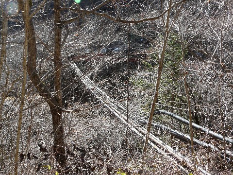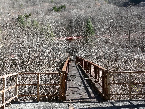 さて画像は・・・ この鉱山で、結構有名な廃病院などがある地区へと向かう事が出来る橋です。 知る人ぞ知る廃病院。 鉱山に事故はつき物!(汗) そして、1000人以上もの人々が住んでいた、この地。 その病院では、数々のドラマが展開された事でしょう! さらに、ココでは・・・ いや! こんな閉鎖された地域では、絶対に起こってはならない「赤痢」が発生してしまった事もあるらしく・・・(爆汗) 伝染病が、こんな山奥の集落を襲った日には・・・(叫) 本当に色んな意味で、ヒューマンドラマが展開されたんでしょうね。 その廃病院も、ここ数年は、心無い人たちによって荒らされたり・・・(怒) って言うか、注射針とか、赤痢血清とかバイオハザード的危険物が放置されている所に、よく入る気になれるものだと・・・(汗) ま、そんな観点からか? そして、去年の台風9号のダメージの加わり。 廃病院へと向かう橋は閉鎖されました。 ちなみに自分は、一度も行ったことがありません! だって、鉱山の敷地内ですらからね! 許可なしに入るわけは行きませんから!! でも、一度は行ってみたかったです(涙)。 来年の春。 まだ、撤去されずに残っている事を祈るばかりです。 ちなみに下の画像は去年の春のもの。 周りの景色(草木)の関係か? 物凄く明るく見えるんですけど・・・ 季節もありますが、閉鎖される前後で随分と雰囲気が変わってしまうものです・・・