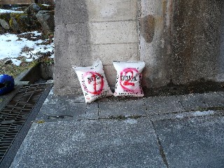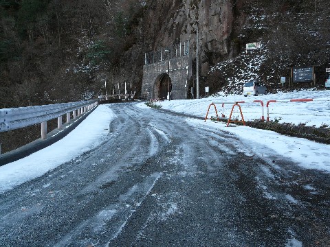 さて・・・ ガチガチに凍結していた八丁峠。(涙) ここは完全な北斜面に面していて・・・ 冬の間は、日中でも陽が当たる事はありません! ですから、一度でも雪が降ったら春先まで溶けないんです(涙)。 そのため鉱山道路は12月から4月一杯まで冬季通行止になるんです。 しかしまあ・・・ まさか11月のうちから、こんな状態になるとは予想すらしていませんでした(涙)。 さて・・・ とにかく走行可能なラインを探す自分。 まだ完全に踏み固められていなさそうな場所を探しつつ、何往復か歩いてみます。 しかし軟らかめの雪の下がアイスバーンになっていたり・・・(汗) 転ばずに通過できそうな場所は、中々見つかりません(涙) 思わず・・・(汗) 八丁トンネル入口に置いてあったコレ・・・ 通称塩カル。 袋の口を開けて、撒いちゃおうかと思いましたよ(汗) とは言え、いくら融雪剤を撒いても、すぐに融ける訳じゃないですからね! しかも、まだこれから長い冬が待っているわけですから、自分が勝手に使うのも悪いですし・・・ 段々と、意地でも、この凍結箇所を通過したくなった自分は・・・(汗) でも、何となく踏ん切りが付かない自分は・・・(小) 暫くの間、思慮に耽っていたのでした・・・ つづける?