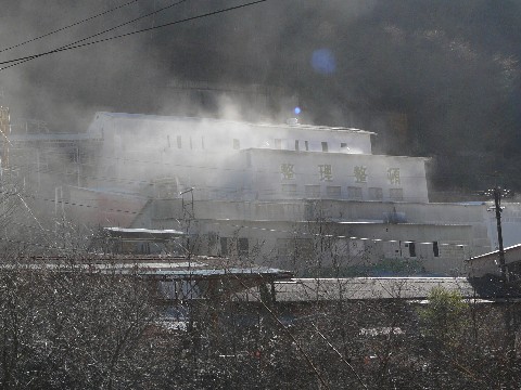 今年に入ってからなのですが・・・ この鉱山の精製所。 日曜日にもかかわらず、毎回の様に白い煙が噴出しています!! 今のご時世。 仕事があるってだけでも幸せだよね!? 個人的には、休みの日まで仕事があるなんて、ちょっと羨ましかったり・・・ って、全然関係ないですけど(汗) しかし、なんかヘンなんですよ! だって、機械が動いている音が殆どしないんです! 普通ならゴウン、ゴウンと低い音が鳴り響いているはずなのに・・・ それに人の気配がしないんです!!(汗) 元々、ここに残っている人の数は少ないですが、稼動日にはそれなりの人の気配が漂っているのに・・・ なお普段なら・・・ 人の気配のする日は、仕事の邪魔をしてはいけないので、自分はこの精製所の前を素通りします。 でも何か、まるで時間が止っているかのように・・・ 白煙で囲まれた別次元に存在するかのように、精製所が存在し・・・ って言うか、このまま消えてなくなってしまうのではないかと心配になってしまうくらいの雰囲気が漂っているんです。(汗) この山の奥に残った昭和の風景と共に消えてしまうのか? この鉱山!?(滝汗) この白い煙が晴れたら、何も残っていなかったなんて事は無いのか? この鉱山!?(滝汗) 来年の春まで残っていてよね!(願)