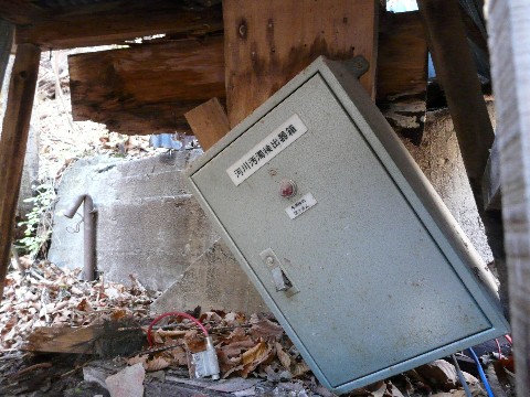鉱山道路'08ファイナル編。 冬枯れの季節・・・ って、この言葉で始まる事が多いような気もしますが・・・(汗) でも本当に、この季節じゃないと気が付かずに通り過ぎしまう物件も多いんですよ! ココは・・・ さて画像は、これも2005年の初夏以来、その存在すら忘れていた河川汚濁検査装置。 って、なんかボロボロになっているんですけど・・・(汗) 去年の台風9号が通過したとき、すぐ脇にある沢が増水して流されかけたのか?(滝汗) それとも、冬場の雪の重みと長年の疲れで? いずれにしても、何かフィルターっ言うか、レギュレーターみたいのが出ちゃってるし(滝汗) ま、以前から「ちゃんと動いているのか?」疑問だったけど(笑) とりあえず・・・ ドアが半分開いていたので、中を覗きこんでみました(汗) 手前の傾いているのが装置の制御部のようです。 おそらく・・・ この装置の基礎となる部分にパイプが通っていて・・・ 沢から水を引いてきて、そこのph値なんかを測定するような感じなんですけど。 で、何かがあれば制御部のランプが付くみたいな。 でもこれは・・・(汗) どう考えても、現役で使われるいる感じはありません。 何せ、センサーっぽいのが外れていますしね!(汗) ま、この上に存在した捨て石場は現在では使用されていませんからね! それに廃坑も存在しないはずですから。