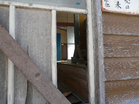 封印された廃銭湯。 ドアに打ち付けられたバリケードが、逆に人を惹き付けてしまうのか?(汗) よく見ると、無理矢理ドアを開けようとした形跡なども残っています!(怒) なお念のために言っておきますが・・・ ここは現在使われていないといっても、鉱山の所有する施設の一つです! 勝手に中に入ったり、入ろうとしたりするのは禁止されています! この辺を勘違いしてはいけません! 勝手に入れば、不法(家宅)侵入罪で通報されますし、普通に逮捕されます!(注) また、窓を割ったりドアをこじ開けようとすれば器物破損(または損壊)で身柄を拘束されます! そして、こう言った行為が絶えないと、警備上の都合で建物自体の取り壊しに発展しかねません! そこで昭和が途絶えてしまうのです!! でも・・・(汗) 今回も、外れた板の隙間からの一枚を撮っちゃいました・・・(汗) 本来なら、この行為も良俗に反する行為と言う事になってしまうのですが・・・(謝) 以前と比べて、奥の扉が開いていたりします。 やはり不法侵入を試みる人が多いのでしょう!(怒) 皆さん、そのような行為は絶対にやめましょう! そして建物も老朽化していますから、中も大変危険な状態になっている場所があります。 絶対に中に入らないでくださいね!!(願)