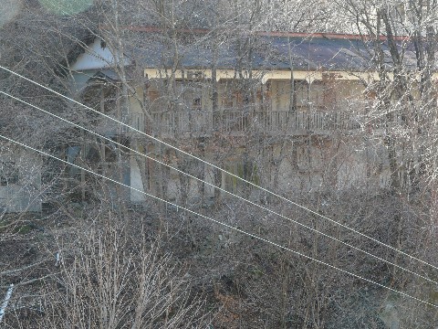 鉱山道路'08ファイナル編。 冬枯れの時期。 ふだんは木々や薮に隠れていて見えていなかったり・・・ あるいは建物があるのが分かっているけど、薮の中のため画像を撮るのを躊躇したりすることもあるのですが・・・ その一つが、切り立った崖の上に立つ廃家族寮(汗) いや、もしかしたら以前に地形的変動(土砂崩落)があって、こんな状況になってしまったのかもしませんけど(汗) しかし、物凄い場所に建てた物です。 この狭い谷間に1000人を越える人が住んでいたわけですからね! しかも家族揃って! 少しでも平らな場所が確保できれば、そこに寮を建ててしまったのかもしれません! ちなみに、この崖っぷちの家族寮。 ウワサによると、当時ココに住んでいた子供が使っていた自転車が放置されたままだとか?(汗) って、こんな場所に自転車なんて!(叫) あまりに危険そうな場所なので、自分は近寄りたくないですから行きませんけど!(汗) 夜は月が出ていなければ真っ暗闇でしょうからね。 そして冬は確実に足元が凍結しているでしょうから! それに寮の玄関先に柵とかフェンスも付いていません!(滝汗) 結構怖い物があったのではないかと・・・(汗) そして、ここも解体されることになったとき(汗) どうやって作業をするのでしょう???