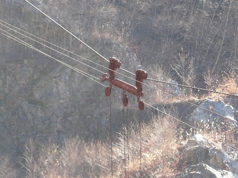 鉱山道路'08ファイナル編。 色々な景色が、順次消えていってしまう鉱山道路周辺(涙) でも・・・ 意外としぶとく残っている物もあったりします。 それが・・・(汗) 精製所と捨石場の間にある谷間に架かっている吊り橋跡。 ちょうど、道幅が狭いところを走る区間で、注意していないと気が付かない事も多いのですが・・・ 空に「何かヘンなものが見える」ような気がして・・・ よくよく見ると、ワイヤーのような物が数本張ってあるのが分かって・・・ で・・・(汗) あれ、吊り橋じゃないの? もしかして???(滝汗) (板の部分は無くなっていますけど) ま、そんな状態になって始めて分かるような存在なのですが・・・(笑) この吊り橋。 こんな状態になりながらも撤去されずに、ずぅ~っと宙を舞っています。 索道のワイヤーとか撤去されちゃったのに、何故か吊り橋のワイヤーだけは残っています。 確かに、ここを渡るような人は絶対にいませんけど!(笑) そして、仮にワイヤーが切れても、まず人だ立ち入るような場所ではないので何の危険性もありませんけど。 撤去するにも、あまりに山奥過ぎて大変なのは分かりますけど。 けど、見ていると結構壮大なので残ってて欲しいですけど。 この鉱山の廃施設の撤去基準って、どうなっているのか? ちょっと知りたい気分になったりします。