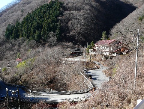 鉱山道路脇を流れる川に架かる画像の橋。 そこを渡ると・・・ って言うか、絶対に許可無く渡ってはいけません!(汗) そこには警備会社の出張所が待ち受けているらしいですから!(笑) でも・・・ その橋の先にあるのは、警備会社だけではありません! この地区で最も有名な木造校舎の小倉沢小中学校の廃校舎が残っているんです。 基本的に、ここの鉱山住宅に住んでいた人達は中学校を卒業すると、殆どの場合は高校に進まず親の背中を見ながら鉱夫を目指します。 って言うか昭和初期、鉱業が栄えていた頃は、稼ぎの良い鉱夫はある種の憧れの的たったようで・・・ 人里はなれた山の中にあろうと、人材まで自給していた???(汗) と言うのは冗談ですけど・・・(謝) その子供達が通った小中学校(共通)が、橋の向こうに残っているんです。 ついでにいえば、教材として使われていたトロッコとかも残っているそうで・・・(涎) ま、その話は置いといて! いつもは川向こうの薮の中に潜んでしまっている小倉沢小中学校。 枯れ枝の隙間から、そのシルエットがちらほらと見え隠れしています。 が・・・ 思った以上に大きいんですよ! そして広大なんです!! しかも、かなりの範囲に渡って講堂(体育館)とか、いろんな建物が建っているんです!(驚) この季節でないと、実感できない大きさを知ったのでした。 ただし、間違っても橋は渡らないように! 確実に不法侵入で捕まりますから!!