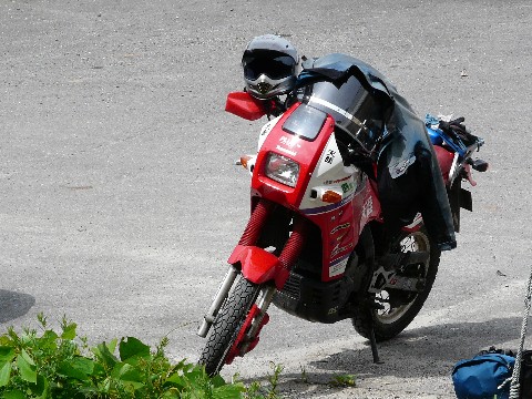 今年気になったバイク'08。 今日の話題は、今年出た新型の話題ではありません。 今年見かけたレア物の話題です。 自分で言うところの「レア物」ですから・・・ もちろん「不人気車種」と言う事です!(汗) って言うか、コレを見たとき・・・ 自分でも、すぐに名前が思い出せませんでした!(笑) とにかく、リアフェンダーの形からカワサキのKLシリーズだと言う事は想像が付いたのですが・・・ 実はその昔・・・ ビックオフローダーに憧れ・・・(笑) 特にパリダカレプリカは好きでしたしね! 少しジャンルが違うけどトランザルブ(400だけど)に乗っていた時代もある自分。 実際には、その重さを持て余し・・・(爆汗) ダートでは苦戦しまくった記憶しかないのですが・・・(恥) それでも、今でも結構好きだったりするんですよ、この手のバイク。 で・・・ このバイク。 オーナーの方が、タンクに堂々と名前を書いていてくれているのに、名前を思い出すのに時間が掛かりましたよ(笑) だって、実際に現物を見たのが初めだったもので! 確か国内には200台程度しか入ってきていないはずの・・・ このTENGAI 発売期間だって、1年か2年程度のはず!! 今年見た、レア物No.1の座は確定です!!(笑)