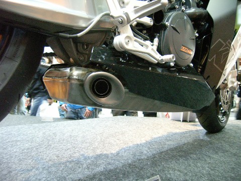 今年気になったバイク'08。 はたして効果は如何ほどに??? タンクの端っこに付けたられたスライダーパッド。 転倒した時に、車体に来るダメージを少しでも和らげてくれるための装備。 の、はず・・・ でも、コレだけで効果があるのかは不明です!(汗) って言うか、ミラーとハンドルバー&レバー類は、確実に折れたり曲がったりしちゃいますけどね・・・(汗) これだけだと。 さらに!! もし倒してしまったも、サイレンサーのダメージも最小限に抑えられるようになっている(?)、このバイク!! 何せサイレンサーが車体から「はみ出していない」ですからね 立ちゴケしても、傷が付いたり曲がったりする心配はありません! ただ・・・ よくもまあ、コレだけの容量で排ガス規制や騒音規制をクリアできた物だと感心してしまうのですが。 ま・・・ 日本仕様は、物凄くさびしいくらいにパワーダウンされていますからね! それで何とか規制をクリアしているのでしょう。 このRC8 オフ車メーカーのイメージが強かったKTM。 ここ数年はMotoGPの125ccクラス&250ccクラスに積極的に参加し、ロードスポーツのイメージも築きつつあり。 そして満を持して発売されたRC8。 この奇抜なデザインも含め、色々と気になるバイクです。