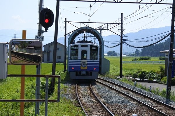 音もなく? 静かに・・・ そして田んぼの中を爆走してくるオレンジ色の物体!(笑) ゴメン! 一瞬・・・ 自分の頭 脳内処理が追い付かなかったよ!(泣) って言うか、何が起きているのか? 理解するのに物凄く時間が掛かってしまい! その間! 物凄いスピードで爆走してくる、あのオレンジ色物体が何なのか? 理解が追い付かなかったよ!(泣) で・・・ デジカメ構えた時には、既にココまで接近を許してたよ! って言うか、偶然にもホームの端っこにいたから良いような物の・・・ しかも! 時刻表に乗ってなかったから 何かが来る事すら警戒してなかったし!(困) で! 止まるような気配もなく! そのまま爆走して通過!(唖) って言うか!(叫) ドア 開けられないし(滝汗) 車体が低すぎてホーム高さが窓の位置に来てるし! って言うか・・・ 低床の路面電車が田んぼの真ん中を爆走してくるとか! ゴメン! 想像すらしてなかったよ!(泣) 決して・・・ 車庫から出て来た回送電車ではありません! なんと! 福井鉄道から急行運用で乗り入れてくる低床型3連の路面電車です! で! この中角駅のみ通過して行きます! って言うか・・・ この、周りに田んぼしかない 仮設駅みたいな・・・(寂) しかも、車体が低すぎてドアが開けられないという(泣) 中角駅 見事なまでのスルーっぷり!(笑) いや! それ以前にね! 低床の路面電車って、あんなにスピード出るんだ!?(驚) 動輪の径が小さいから、そんなスピード出ないと思っていたのに それよりも? 市街地を周りの自動車の流れを避けながら走るから、加速性能はともかく トップスピードは大して高くないと思い込んでいたのに! 有り得ん! しかも路面電車が田んぼの真ん中をとか!(笑) いや? 昔は当たり前の世界だったのかもしれないけど? でもコレ! 冬場、田んぼが雪の下に埋まっている時 一体、どういう光景になるんだろう?(笑) なお最近では・・・ えちぜん鉄道も自前の低床連接式の路面電車を造り 福井鉄道へと相互乗り入れを始めたそうで とにかくDA! 一つ手前の・・・ 路面電車折り返し駅(乗り入れの終点駅) 鷲塚針原まで戻って 一体どういう構造になっているのか? 見に行こう と言う訳で! やって来たのですが・・・ ん? 乗り入れの終点駅 って事は、ソコソコ開けた街があって 立派な駅が?? ん? なんかイメージと違うぞ!? コレ・・・(焦) しかも! また、この両側ギリギリの狭いホームかよ!(怯) コレ 本当に・・・ 両側に電車が停まったら結構怖いぞ!(泣) あと・・・ なんか、線路落ちそうで物凄く不安になるんですけど(涙) で! その脇に低床車専用のホームが って、低っ! それこそ? 開業当時(昭和3年)の電車サイズ? 何と言うか? このバリアフリーって何ソレ、食べると美味しいの? みたいな階段を登らないといけない、えちぜん鉄道のホームと比べて(焦) さすがは低床車用 車いすの人でも、安心してホームに上がって乗れちゃうという構造 でも。 向こう側の道路からは階段上らないと駅に入れないという(困) ちょっとした落とし穴? でも! 改めて見てみると・・・ その高さの差が凄すぎだな? コレは・・・(焦) 中角駅でドアが開けられないからという理由で通過しちゃうのが良く解かるな! って言うか、2年前に突貫工事で造ったらしい? と言うのも(焦) 福井鉄道からの乗り入れ 終点駅を何処にするかで、少し時間が掛かったらしい? 本来であれば 3つ先にある有人駅の西長田ゆりの里 余談ですが・・・ この鷲塚針原から先の4つの駅の名前が(焦) あとから付け加えたサブネームが・・・ 太郎丸エンゼルランド 西春江ハートランド 西長田ゆりの里 下兵庫こうふく と・・・ なんか物凄くインパクトが強いんですけど! でも今回は(悔) 時間が無いから(涙) また次回以降のお楽しみと言う事で とりあえず、駅名の事は置いといて! この鷲塚針原駅 なんと!(驚) 木造の無人駅でした! 折り返し駅に指定されたくらいだから 駅員さんが居て、それなりに大きい駅かと思ったら(焦) 国の登録有形文化財に指定されているけど! 駅事務所跡だとか、宿直用の部屋があったという形跡が残ってるから? 昔は、それなりに利用者が多かったことは想像できるけど! どうして、この鷲塚針原駅が折返し駅になったのか? その理由が知りたい気分だぞ? まあ何となく予想できるのが・・・(焦) 福井鉄道の武生から田原町経由で しかも急行運用でりれ入れてくるのに1時間以上かかる で・・・ まだ新型の低床車の配備が、それほど多くない(困) と言う事で あまり奥の駅まで乗り入れちゃうと、福井鉄道内で使用する電車の数が足りなくなる(焦) と言う事で? 妥協点として選ばれた? あと、駅前の土地も余ってるし 低床車専用のホームを造る土地が余っているかどうかという点も考慮した結果が? この鷲塚針原駅になったのではないかと? 本来であれば! 商業的に考えれば、最低でも「あわら湯のまち駅(芦原温泉の玄関口)」くらいまでは乗り入れしたかったのではないかと? 北陸新幹線の開業後は 武生は今以上に悲惨な状態になりそうな気もしますし(涙) 特急の
