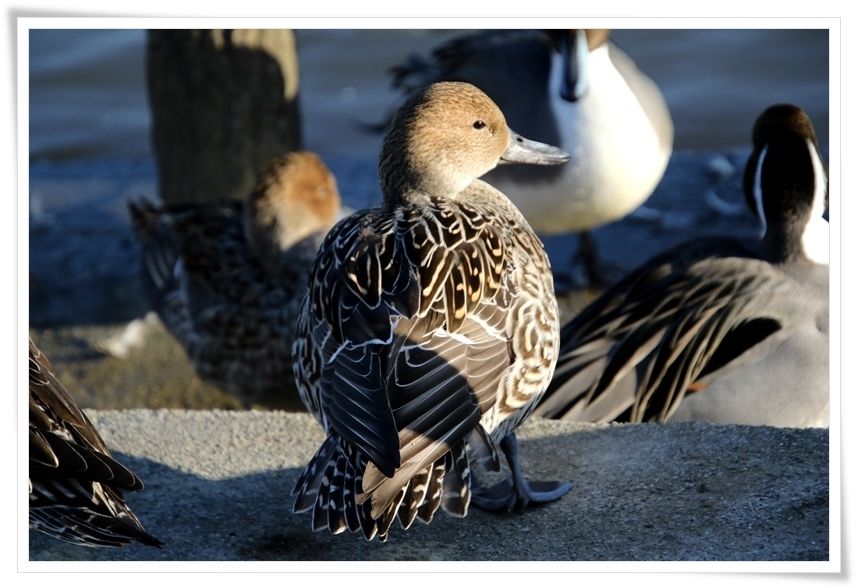 今日のお天気は 最高気温 8.9℃ 最低気温 5.1℃今日は仕事の火曜日昨日のいいお天気が嘘のような気がしますだって・・・・・今日はどんよりとした空模様でスタートでしたからね朝は傘を持って出勤 天気予報通りにが降ってきました気温はちょっと高めで寒さはあまり感じなかったかな~でも・・・・・・昨夜は早く寝るつもりがなかなか眠れず今日は寝不足気味で足がだるいよ~今夜こそはサッサと寝るぞ~昨日の続きです白鳥に会いに ~田尻池・Part.3~ <1/30>オナガガモ今日はこの 田尻池 で一番数が多いこのカモからスタートしますよ~オスは尾羽がしゅっと長いので オナガガモ って言う名前になったんでしょうね池の中にもたくさん居るんだけどこうやって階段状になった場所に上がってのんびりしているのもたくさん居ます人との距離もかなり近いです眠たそうにちょっと目を細めているオスこの日はお天気が良かったのでポカポカ日向ぼっこですね遠くから見るとオスの顔は茶色に見えたけど、角度が変わると目の後ろから後頭部は緑色に見えるよ昨日紹介した キンクロハジロ の顔もそうだったよねメスは全体的に茶色で、黒い目がぱっちりしてて可愛い雰囲気だね茶色と言っても体の部分で色も模様も違っていてちょっとお洒落なんですよ~お洒落と言えばやっぱりオスの方が断然お洒落かも~体の横の部分は、遠くから見るとグレーっぽいけど近くで見ると 鮫小紋 のように細かい模様になっていますこのオスは、特徴の長い尾羽が無いねちょうど生え替わりのタイミングなのかもねコハクチョウ も オオハクチョウ も成鳥になるまで3年掛かるそうです幼鳥は体がグレーっぽいし、嘴の付け根の黄色くなる部分がまだ白色をしています右手前のは、体も真っ白じゃ無いし嘴の付け根の部分もまだ白色いきなりこっちにグイと近づいてきたよ好奇心が旺盛なのかな~カメラのレンズが気になるのかもしれませんね目に光が当たっているので、虹彩と瞳がくっきりと見えていますいきなり大きな声で鳴いたのでびっくりです右側のは、閉じた嘴の先から舌がチョロッと見えてるよ~あっかんべーしているわけじゃないよねこっちは大きなの有る方ここに車を停めて、池の様子を見ている人がほとんどなんだけど・・・・・・ここに車を停めるとちょっと困ったことが起きるんですそれはまた後から紹介する事になるかな~が少し傾き始めているので、自分の影が長くなって地面に写り込んでいますここにも オナガガモ がたくさん羽を休めています湿った地面には無数のカモたちの足跡たくさん有り過ぎてどっちを向いているのか分からないくらいですさっきのフェンスの有る場所と池のカモたちの距離がかなり近いのがこうやって見ると分かるでしょ~普通の公園などではこんなに近くで見る事は出来ないよねカモたちはしょっちゅう鳴いているのでかなり賑やかなのがこれで分かるかな今日はここまで、この続きはまた明日ね~今日のたち Jun花音 さっきからあくびが止まらないよ~今夜は横になったらすぐにでも眠れそうだよ~ chappyへの個人的メッセージはこちらから