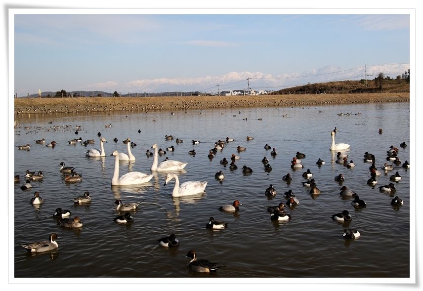 今日のお天気は & 最高気温 8.2℃ 最低気温 1.4℃今日は日曜日、仕事はお休みです今日は午前中は晴れ間も有ってどこかに出かけられるかな・・・・・って思っていたんだけど青空は長い時間は続かないって感じかな~金沢では冬の青空ってやっぱり貴重なんだよねどんよりとしたグレーの空ばかり見てるとやっぱり青空が恋しくなっちゃいます気温も少し上がって来て、雪景色も無いしね~こうなると何を撮っていいんだか・・・・・・今日は出かける時に一応カメラも持って行ったけど何も撮れずに帰ってきちゃったその代わりにちょっとだけ近くで買い物してきたよ今日から新しいシリーズです白鳥に会いに ~田尻池・Part.1~ <1/30>お天気に恵まれた1月の月末母と二人でちょっとドライブに出かけました金沢東IC から 北陸自動車道 に乗り 富山方面へ 13:33スマホのナビをセットするために立ち寄った 小矢部川SA 剣岳 がうんと近くに見えて凄く綺麗でしたよ~北陸自動車道 は山間部を抜けると道路の向こうにこんな風景が広がるのでドライブも楽しよ~小杉IC で 北陸自動車道 を下りて、スマホのナビの案内に従い目的地の近くまでやって来ました電信柱や電線が無ければもっと素敵だけどね~田尻池 14:45ここが今回の目的地です田尻池 は農業用に作られたため池 広さは 約0.05キロ平方メートル路肩に作られた駐車スペースに車を停めてさっそく散策を始めますよ~ブロックで作られた池の斜面にはずらりと オナガガモ が羽を休めていました岸に上がって寝ているのが多いかな・・・・・・池の畔にはベンチが設置された広いスペースも有りますここからフェンスの有る場所までは階段のようになっています池の中には 何種類かのカモたちと オオハクチョウ が居ましたオオハクチョウここでは人を怖がらず比較的近くまでやって来ますどうしてかと言うと・・・・・・ここでは オオハクチョウ や カモ たちに餌を与えているからなんです 2019.1.11撮影コレは、金沢の郊外で撮影した コハクチョウ田尻池 に居るのは オオハクチョウ 違いが分かるかな左: コハクチョウ 右: オオハクチョウ違いが分かるようなを選んで並べてみたよ嘴の付け根の黄色の部分と鼻の穴の位置を比べてみると分かります田尻池 に行くまでは、どちらの白鳥がいるのか知らなかったんだけどねコハクチョウ もやって来るらしいですが、今回見つけたのは全部 オオハクチョウ でした体のサイズは オオハクチョウ の方が一回り大きいようですが・・・・・・単独で見るとその違いはほとんど分からないと思いますだから見分けるにはやっぱり嘴の黄色の部分を見ないとね金沢の郊外で見られる コハクチョウ は餌付けされていないので、近づくとやんわりと逃げちゃうけどここでは定期的に餌を貰えることが分かっているので近くで観察できますこの時間帯だと オオハクチョウ の数はそんなに多くは無いようですよ~昼は別の田んぼなどで餌を食べているそうですからね今日はここまで、この続きはまた明日ね~今日のたち Jun花音 明日はちょっとやっておかなきゃいけない事を急いで済ませなきゃ~有る程度準備は終わってるんだけどね chappyへの個人的メッセージはこちらから
