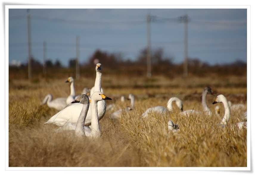 今日のお天気は 最高気温 7.9℃ 最低気温 1.8℃今日は仕事の火曜日昨夜は布団に早めに入ったつもりだったのに、なかなか寝付けずにやっぱりあのお昼寝がいけなかったんだよね~今日のお天気は、天気予報撮りにがに変わってきましたチラチラと小雪が舞う程度で積もる事は無かったんだけど、やっぱり気温は低めです明日はもっとが酷くなってくるんだとか・・・・・・もう降らなくてもいいんだけどな~今月は人件費カットが厳しい月だって前に書いたけど・・・・・・今月の後半に入って更に厳しい状況になってきました今日も更に1時間仕事の時間がカットされて早く帰ってきました今月は有給休暇の申請をたくさんしなきゃね~河北潟のコハクチョウ ( 1 ) Part.1 <12/9>冬の使者 と呼ばれている コハクチョウ今シーズンもいつものようにやって来ているニュースは耳にしていましたがようやく会いに出かけるチャンスがやって来ました広い 河北潟干拓地 のどこかにいるのは分かっているけど・・・・・・相手は翼を持つ野鳥なので必ずここに居るとは言えないからね周りに注意しながら干拓地の中の道路を遠くからでも田んぼの中の白い集団は目立つので見つけるのはそんなに難しくないんだけどねコハクチョウここに飛来する 白鳥 は コハクチョウ4000km 離れた シベリアのツンドラ地帯 から日本に越冬の為に飛来しますオオハクチョウ は一足早く 3000km 離れたタイガ地帯からやって来ます体が一回り小さい コハクチョウ の方が長い距離を移動できるんだって~長い旅をするには体重も影響するんだね田んぼの中の農道に車を停めて、車の中から観察しているんだけど最初はやっぱりちょっと警戒してこちらの様子を伺っているという感じですみんな緊張して首を伸ばしてこちらを見てるでしょしばらくして安全だと分かって来ると様子が少し変わってきます近づく前はもうちょっと手前の方にも居たんだけど、やんわりと距離を取るために遠ざかって行きますこのくらいなら安全という距離が有るんでしょうね飛来してすぐはやっぱり警戒心も高めだしね中央にいるちょっとグレーっぽい子は幼鳥です白鳥は生まれてから成鳥になるまで2年くらいかかるんだとか・・・・・・その年に生まれたばかりだったらもうちょっと濃いグレーをしてるかな嘴の付け根の部分、つまり黄色の部分も幼鳥の時は白っぽいよ白鳥たちの警戒心が少し和らいだところでゆっくりと車を下りてもちろん白鳥たちを驚かせないように大きな動きはしないように気を付けながらです少しこちらを気にしていた白鳥たちも慣れて来ると餌を食べる方に一生懸命になります野生で生きるには1日のほとんどの時間を餌探しと食べる事が占めているよね離れた場所から1羽の コハクチョウ がこちらへ向けて飛んできましたよ~目の前でちょっと旋回お腹の辺りがちょっと泥で汚れてるね~翼の先の方のしなり具合、凄いよねこの後少し離れた田んぼに着陸したようでした今日はここまで、この続きはまた明日ね~今日のたち Jun花音 明日はの予報だよ~積もらないといいんだけど・・・・・・ chappyへの個人的メッセージはこちらから