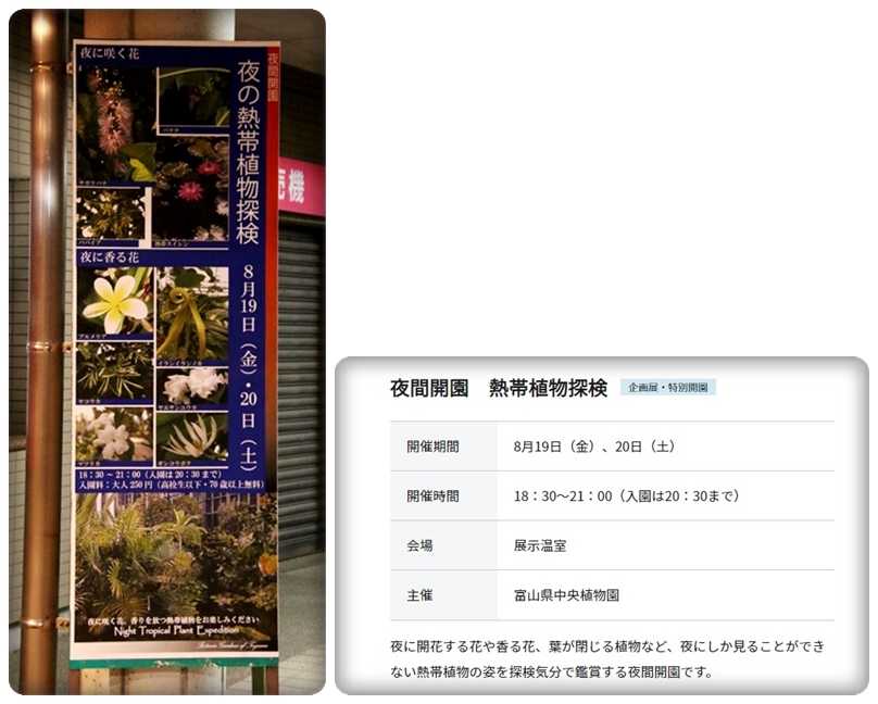 今日のお天気は 時々 最高気温 28.3℃ 最低気温 17.4℃今日は日曜日、仕事は休みですもう少し我慢すれば気温が下がるとは聞いているけど・・・・・・残暑って普通は9月の事だよね10月に入ってこの暑さはやっぱりちょっと異常だと感じてしまうよね通常なら衣替えの季節だけど、まだまだ半袖は必要だよね昼の暑い時間帯はから出る気にもなれずに過ごしてたんだけど午後から夕日が綺麗だったら海岸へ行ってみようと思っていたのに、夕方が近づくと空の様子はパッとしなくて残念最近綺麗な夕焼け空を撮って無いな~夕日の綺麗な秋を感じられる日が恋しいよ今日から短いシリーズを始めます夜の熱帯植物探検 ~富山県中央植物園・Part.1~ <8/19>19:41タイトルでも分かるように、夜の植物園の公開が有るのを知って見に行ってきましたお隣の富山県に有る 富山県中央植物園 です一般公開は2日間だけというイベントなんだけどね普通なら夜のお出かけはしたがらない母ですが、今回は見たい花が見られるとの事で一緒に出掛けました今回のイベントが有る事は Instagram への投稿を見ていて分かりました普段は入園料は 500円 だけど、このイベントの時は 250円高齢者は無料と言う点は昼と同じでした夜の暗闇の中に温室の灯りが浮かび上がるようにして見えています夜でライトが付いていると明暗が強くなるので、いつも見るのとは違った景色に見えちゃうよね 植物園HPより今回公開しているのは 1~6 の温室だそうです富山県中央植物園 を初めて訪れたのは 2019.3.8 でしたこの時温室の様子も撮って来たんだけど・・・・・・ブログでは紹介してなかったかな~広くていろんな植物に出会える温室は凄く素敵だったんだけど・・・・・紹介してたら話が先へ進まないので、今度改めてって思っていたらお蔵入りになっちゃった一番最初に見たのは 1番 の温室 熱帯雨林植物室 ですサガリバナ温室に入ってすぐのところで咲いていました実は今回この花を見るのが一番の目的だったんですいきなり咲いているのに遭遇して大興奮ですサガリバナの説明を書いたパネルを夜に咲いて朝には散ってしまう花ですよ~の番組でこの花を紹介しているのを見て、いつか見て見たいと思っていました夜の植物園は所々にライトは設置されてはいるんだけど・・・・・・・全体的には昼の明るさとは全く別の世界です一つの花を見るとこんな感じですネムノキ の花と同じように、長く伸びているのは雄蕊の花糸かな・・・・・・・明るさが足りないとカメラはピントを合わせるのが難しいので、念のため持って行っていた懐中電灯が役立ちました長い紐状の花序の上の方から順番に咲くようですね床の上のガラスの器には散った花が水に浮かべて置いてありましたここでかなりの枚数のを撮ったけど・・・・・ブレているのが多かったかな入り口から次々に人が入ってきたのでとりあえず一旦この場所を離れる事にしました他にもいろんな植物がみられるからねヘリコニア・ロストラタ熱帯地方の植物の名前って舌を噛みそうな名前が多いかも~色合いが鮮やかなのも特徴だよね温室の天井は凄く高く作られているんだけど素の天井に迫るほどの背の高い植物が葉を茂らせていますヘリコニア・カアリバエアプラスチックで作ってある造花みたいな雰囲気がするかな・・・・・・鳥がとまれるほどって説明版にも書いてあるしね天井にライトは設置されているけど茂っている植物の葉っぱが光を遮るので、下に居るとちょっと薄暗さを感じてしまうかな今日はここまで、この続きはまた明日ね~今日のたち Jun花音 明日は仕事なんだけど・・・・まだ暑いのかな何を着て仕事に行くかが問題なんだよね~ chappyへの個人的メッセージはこちらから
