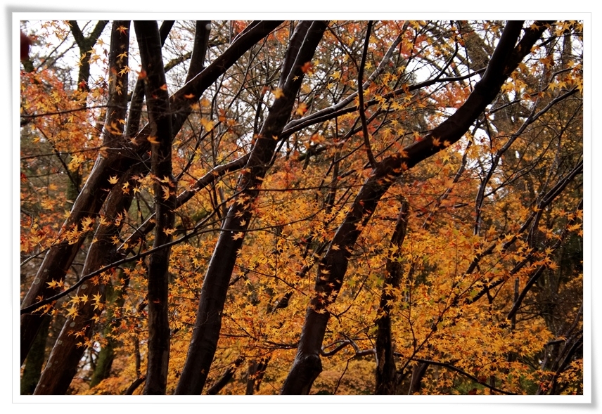 今日のお天気は 最高気温 5.5℃ 最低気温 0.9℃今日は土曜日、仕事は休みです曜日によっては今日から仕事と言う年も有るかと思いますが今年は土曜日だから連休が長くなったんだよね来年の4日は日曜日、再来年は月曜日です今からそんな先の事考えてもしょうがないけどね~今日は予定も無く、でゴロゴロ・・・・・・今思い返せばお昼寝ばかりしてたかも~すっかり連休モードで生活パターンも乱れっぱなしそろそろ普通のパターンに戻しておかないといけないかな紅葉をもとめて 2024 ( 22 ) ~ 奥卯辰山健民公園 ~ < 12/2 >この日はお天気に恵まれて卯辰山へ何ヶ所か見て回る時は一番奥から行くのがいつものパターンですこの公園、割と広いので紅葉した木の有る場所の中でから近い場所を目指す事にしますドウダンツツジ紅葉した葉っぱは半分くらいはすでに葉を落としているかな色合いは真っ赤と言うよりオレンジ色かなすぐ隣にある小さな池の水面には松葉とモミジが浮かんでいましたが・・・・・・残念ながら水面が光の反射で見えにくいかなツツジもいろんな形に刈り込まれていて雪対策の為にそれぞれに応じた縛り方がされていますさて、こちらのモミジはこの柵の向こう側の道路沿いに並んでいますこの柵が設置されたのは数年前の事イノシシ対策として公園のあちこちに設置されています問題は出入り口のゲートが有る場所が限られている事道路沿いからモミジを見る為には柵の向こう側から行くとダメなのでこちら側の斜面を歩いていく必要がありますここに植えられているモミジは同じように見えてもいろんな種類が植えられています色付きの具合も毎年同じじゃないのかななるべく綺麗な枝を選んで撮ってるんだけど・・・・・・中にはチリチリになってしまった葉っぱが目立つ枝も有りましたこういう時はあまり近づかずに離れた所から撮る方がいい場合も有るよね撮っている時は綺麗なところを選んでいるつもりでも後から改めてみると、これはちょっとね~と言う事も・・・・・・このモミジ、切れ込みが深くて葉っぱの形が好きなタイプだけど綺麗な枝があまり無かったかな今年は全体的に見て赤より黄色の方が多いような雰囲気でしょうか枝に残るモミジと地面の上の散紅葉今回はどちらも楽しめる時期かな自然に地面に散ったこのバランスは人の手が作り出せませんよねもう散り始めても不思議じゃない時期なのにまだこんなに緑色が残ったモミジが有りましたこれはどう見ても色付きの途中の雰囲気だよね他のモミジがみんな葉を落とした頃に美しい紅葉を見せる事になるのかな・・・・・十月桜このモミジたちが植えられている場所の近くに纏めて植えられているんだけど今年は花の付きがあまり良く無いようです夏の暑さと残暑が長引いた影響でしょうか・・・・・公園の奥の方にもモミジは有るんだけど他にも行く場所が有るのでここはこの辺りで引き上げる事にしてココはかなり山の高い所だから、遠くには海も見えています別のルートを歩いてを目指します道路沿いにはいろんな種類の落ち葉が・・・・・・種類が分かる方が少ないかもしれませんね大池池の周りの桜たちもすっかり葉を落として冬木立に変身してました今日はここまで、この続きはまた明日ね~今日の花音 休みが続いて曜日感覚が無くなって来てるかも~ chappyへの個人的メッセージはこちらから