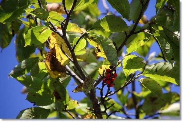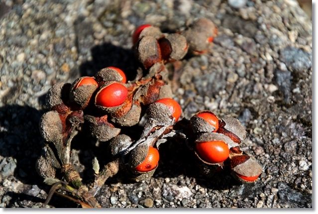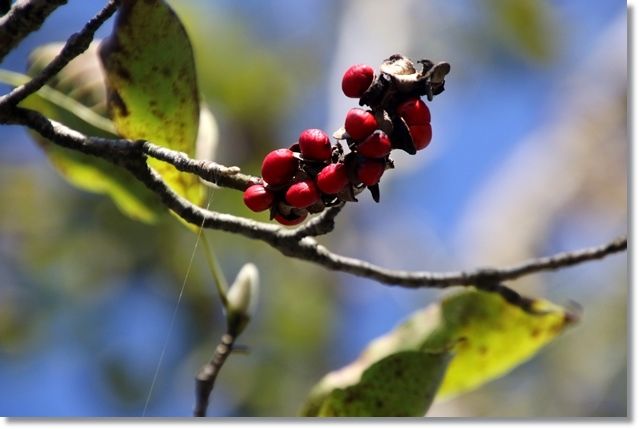 見上げると赤い実が鞘から飛び出していますね