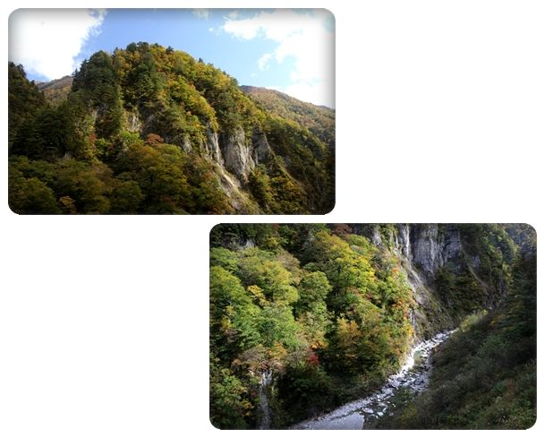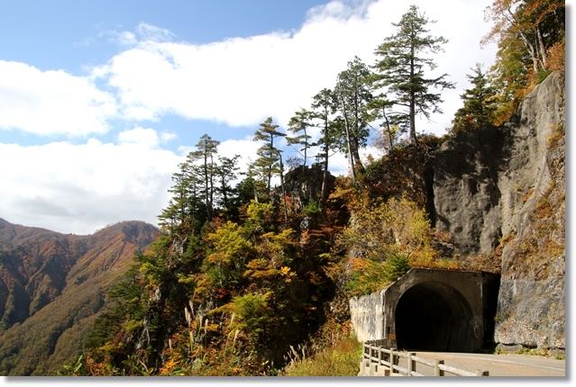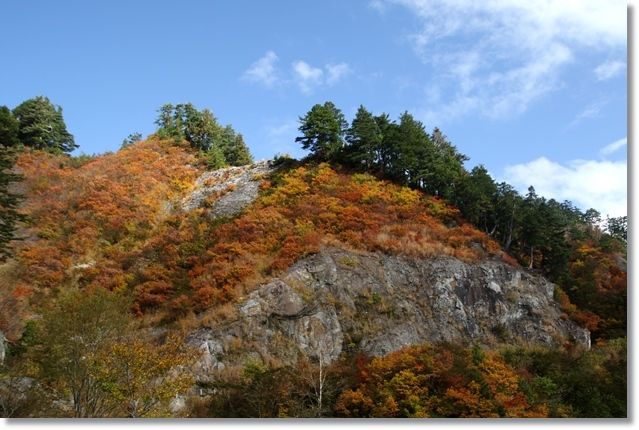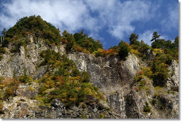 ここは岩肌が露出しているのであまり木が生えてないけど、上の方にわずかに生えている木々はもう紅葉しています