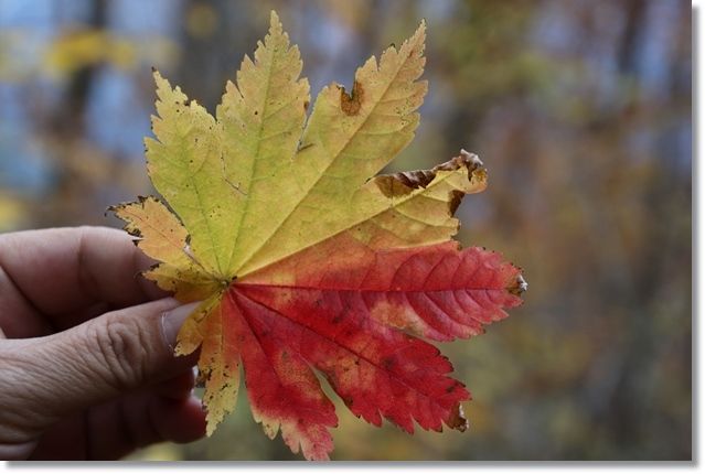 1枚の葉っぱの中に黄色と赤色が同居しています