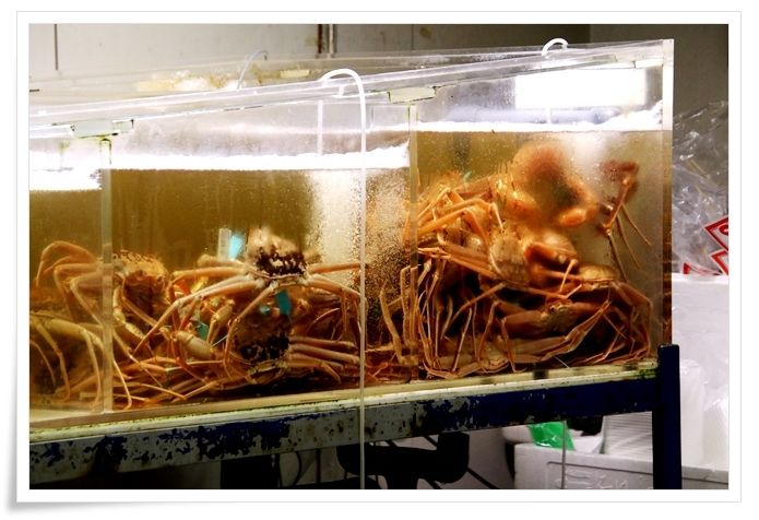 いけすの中には生きたままのカニも売られています