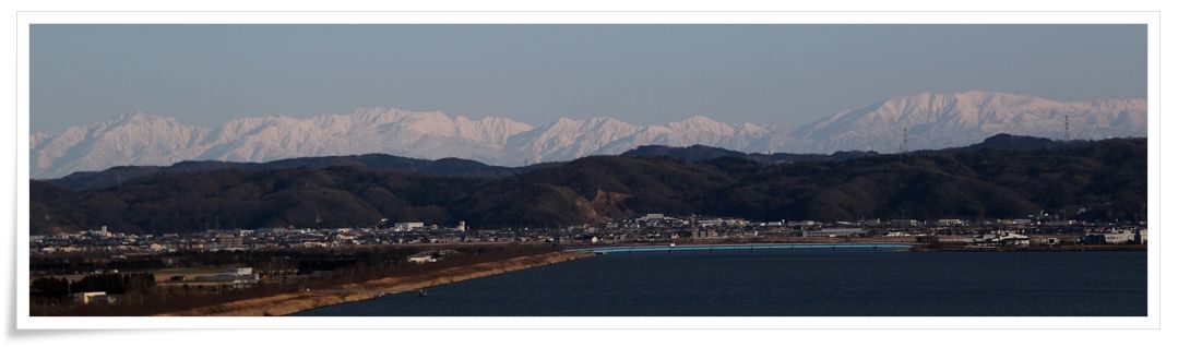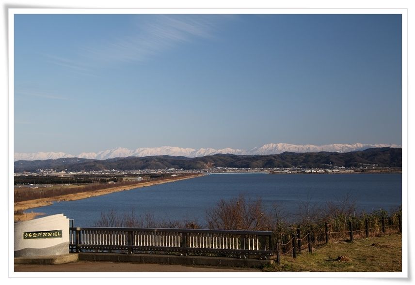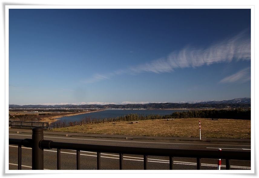 この場所からも 河北潟 とその向こうに白い山並みが見えます