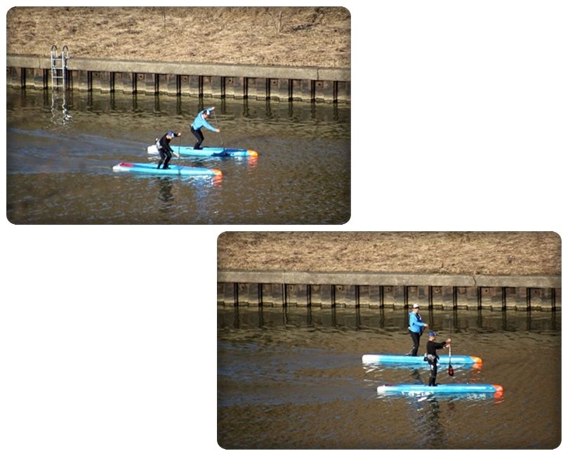ボードの上に乗ってパドルで漕ぎながら進んでいるみたい