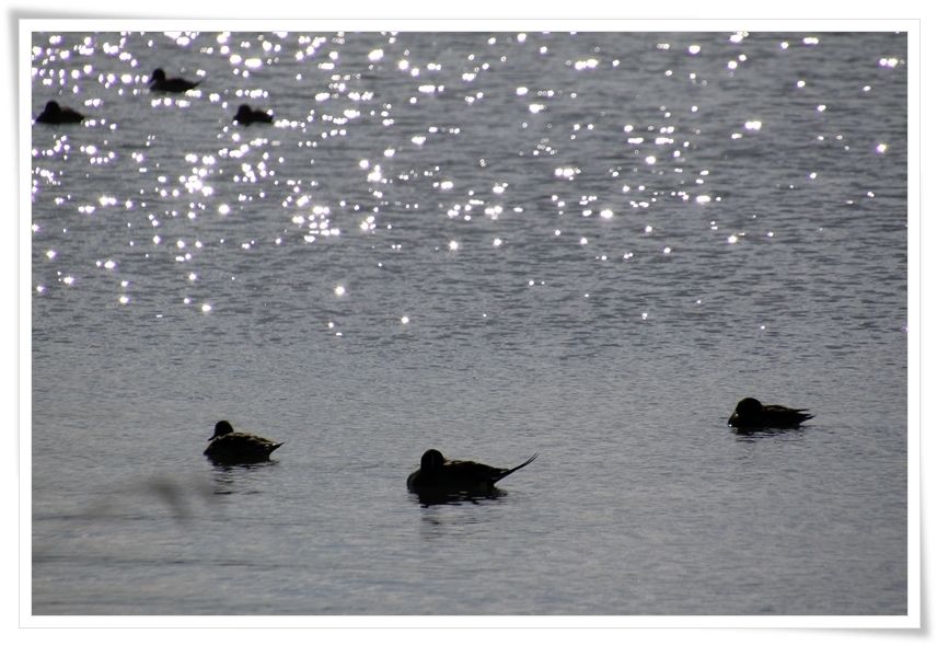 の光を受けてキラキラ輝く湖面にはカモの姿が・・・・・
